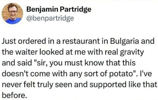 Would you like some caviar and the finest champagne with that order of plural potato?