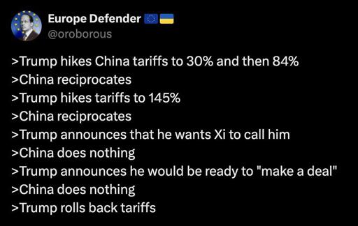 I think Xi might have figured out Trump’s secret. He has no fucking clue what he’s doing. He scares people into reacting by being reckless, then claims a win for getting a reaction.