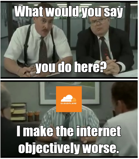 What ever bud, y’all aren’t trying hard enough. I’ve been on the fuck CloudFlare train for ten years. Centralizing surveillance SPOF can eat a bag of dicks.