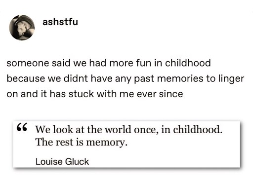 Anyways, my memories lingered, even in childhood. But I think I had more fun back then. The highs were definitely higher, but the lows were lower, too.