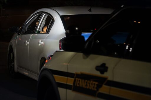 A Tennessee Highway Patrol cruiser and a Tennessee Wildlife Resources Agency vehicle stopped a white car with driveout tags. Inside the car was a woman with her 3-year-old child in the back seat. The toddler peeked out the backseat window, eyes watching the blinking lights and line of vehicles behind them.