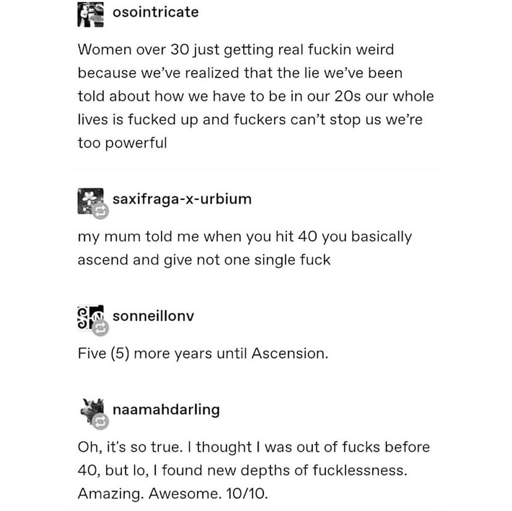 I’m both excited and scared to discover if I have in fact actually run out of fucks to give or if it will change should I make it to 40. I’ll have to ask my wife how accurate this is, she just hit it not too long ago.
