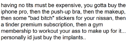 minus-squareThatWeirdGuy1001@lemmy.worldlinkfedilinkarrow-up1arrow-down1·2 years agoThe irony of this post being so downvoted while the other one about small dicks is still close to the top of hot. If saying a dude has a small dick isn’t body shaming then neither is saying a woman has small tits or a loose pussy. You can’t have it one way.