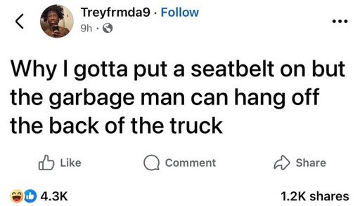 They are HUGE, so it’s gonna take more time to get it up to speed. But more importantly, if it did get hit by another vehicle, it’s more likely that the garbage truck would take least amount of damage and or get moved.