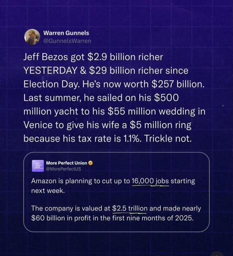 I felt it was implied by the op responding to a decision made by Amazon about layoffs as off Bezos made that decision. You’re right though it’s irrelevant.