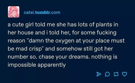 This is gloriously dumb and I love it. “The oxygen at your place must be mad crisp” is peak, unapologetic nonsense, and apparently nonsense works on some people. Respect.