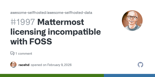 vegetaaaaaaa@lemmy.world to Selfhosted@lemmy.worldEnglish · 5 days agoMattermost is no longer Open-Sourcegithub.comexternal-linkmessage-square29linkfedilinkarrow-up1258arrow-down19