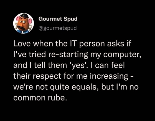 Eh, so when I ask a user (who is a programmer) “did you restart your computer” and they promise me they did, they are just being impatient and lying to me?