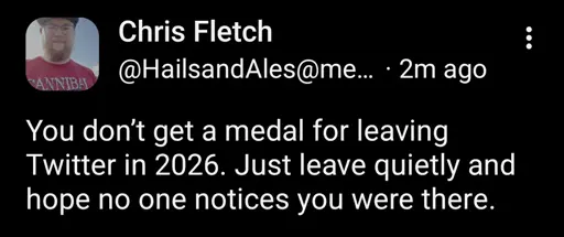 not_IO@lemmy.blahaj.zone to Microblog Memes@lemmy.worldEnglish · 3 days agowhat are people still doing on twitter?lemmy.blahaj.zoneimagemessage-square79linkfedilinkarrow-up1800arrow-down15file-text